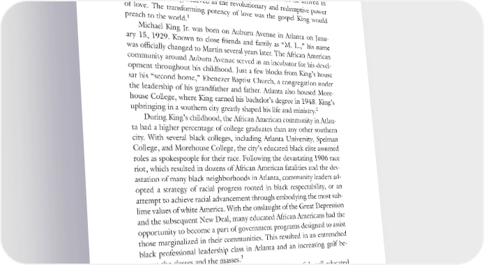 36 BECOMING KING change. King’s earliest religious writings demonstrate that he had worked hard to prepare for this opportunity, crafting a language, a ministry phi- losophy, and a persona that could inspire thoughtful and purposeful en- gagement and the transformation of culture. Years before he arrived in Montgomery, King believed in the revolutionary and redemptive power of love. The transforming potency of love was the gospel King would 1 preach to the world. Michael King Jr. was born on Auburn Avenue in Atlanta on Janu- ary 15, 1929. Known to close friends and family as “M. L.,” his name was officially changed to Martin several years later. The African American community around Auburn Avenue served as an incubator for his devel- opment throughout his childhood. Just a few blocks from King’s house sat his “second home,” Ebenezer Baptist Church, a congregation under the leadership of his grandfather and father. Atlanta also housed More- house College, where King earned his bachelor’s degree in 1948. King’s 2 upbringing in a southern city greatly shaped his life and ministry. During King’s childhood, the African American community in Atlan- ta had a higher percentage of college graduates than any other southern city. With several black colleges, including Atlanta University, Spelman College, and Morehouse College, the city’s educated black elite assumed roles as spokespeople for their race. Following the devastating 1906 race riot, which resulted in dozens of African American fatalities and the dev- astation of many black neighborhoods in Atlanta, community leaders ad- opted a strategy of racial progress rooted in black respectability, or an attempt to achieve racial advancement through embodying the most sub- lime values of white America. With the onslaught of the Great Depression and the subsequent New Deal, many educated African Americans had the opportunity to become a part of government programs designed to assist those marginalized in their communities. This resulted in an entrenched black professional leadership class in Atlanta and an increasing gulf be- 3 tween the classes and the masses. Atlanta provided King with many models of successful, well-educated African Americans who were able to become part of the system and de- liver greater services for their community. He also witnessed the emerg- ing gap between the working and professional classes, a chasm he never embraced. On a smaller scale, Montgomery exhibited similar dynamics
