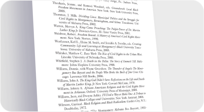 Bibliography 239 Rogers, William Warren, Robert David Ward, Leah Rawls Atkins, and Wayne Flynt. Alabama: The History of a Deep South State. Tuscaloosa: University of Alabama Press, 1994. Smith, Kenneth L., and Ira G. Zepp. Search for the Beloved Community: The Thinking of Martin Luther King, Jr. Valley Forge, Pa.: Judson Press, 1974. Theoharis, Jeanne, and Komozi Woodard, eds. Groundwork: Local Black Freedom Movements in America. New York: New York University Press, 2005. Thornton, J. Mills. Dividing Lines: Municipal Politics and the Struggle for Civil Rights in Montgomery, Birmingham, and Selma. Tuscaloosa: Uni- versity of Alabama Press, 2002. Warren, Mervyn A. King Came Preaching: The Pulpit-Power of Dr. Martin Luther King Jr. Downers Grove, Ill.: Inter-Varsity Press, 2001. Weisbrot, Robert. Freedom Bound: A History of America’s Civil Rights Move- ment. New York: Norton, 1990. Westhauser, Karl E., Elaine M. Smith, and Jennifer A. Fremlin, eds. Creating Community: Life and Learning at Montgomery’s Black University. Tusca- loosa: University of Alabama Press, 2005. Whitaker, Matthew C. Race Work: The Rise of Civil Rights in the Urban West. Lincoln: University of Nebraska Press, 2005. Whitfield, Stephen J. A Death in the Delta: The Story of Emmett Till. Balti- more: Johns Hopkins University Press, 1988. Williams, Donnie, with Wayne Greenhaw. The Thunder of Angels: The Mont- gomery Bus Boycott and the People Who Broke the Back of Jim Crow. Chi- cago: Lawrence Hill Books, 2006. Williams, John A. The King God Didn’t Save: Reflections on the Life and Death of Martin Luther King, Jr. New York: Coward-McCann, 1970. Williams, Johnny E. African American Religion and the Civil Rights Move- ment in Arkansas. Oxford: University Press of Mississippi, 2003. Williams, Juan, and Dwayne Ashley. I’ll Find a Way or Make One: A Tribute to Historically Black Colleges and Universities. New York: Amistad, 2004. Wilmore, Gayraud. Black Religion and Black Radicalism. Garden City, N.Y.: Doubleday, 1972. Yeakey, Lamont Henry. “The Montgomery Alabama Bus Boycott, 1955– 56.” Ph.D. diss., Columbia University, 1979. Young, Andrew. An Easy Burden: The Civil Rights Movement and the Trans- formation of America. New York: HarperCollins, 1996.