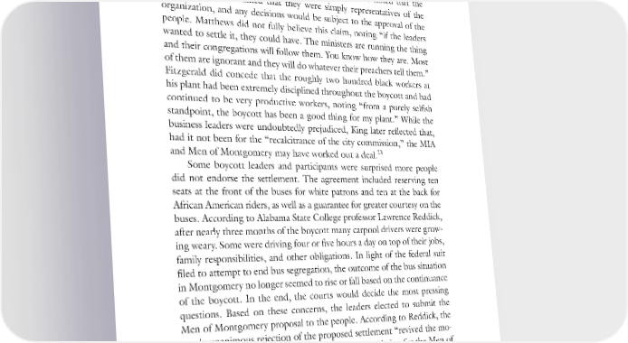 “Living under the Tension” 125 their final meeting, having secured the endorsement of their plan by both the bus company and the city commissioners. When the proposal was taken to a mass meeting on February 20, it was voted down by a reported margin of 3,998 to 2. Business leader G. T. Matthews noted that the MIA leaders had claimed that they were simply representatives of the organization, and any decisions would be subject to the approval of the people. Matthews did not fully believe this claim, noting “if the leaders wanted to settle it, they could have. The ministers are running the thing and their congregations will follow them. You know how they are. Most of them are ignorant and they will do whatever their preachers tell them.” Fitzgerald did concede that the roughly two hundred black workers at his plant had been extremely disciplined throughout the boycott and had continued to be very productive workers, noting “from a purely selfish standpoint, the boycott has been a good thing for my plant.” While the business leaders were undoubtedly prejudiced, King later reflected that, had it not been for the “recalcitrance of the city commission,” the MIA 23 and Men of Montgomery may have worked out a deal. Some boycott leaders and participants were surprised more people did not endorse the settlement. The agreement included reserving ten seats at the front of the buses for white patrons and ten at the back for African American riders, as well as a guarantee for greater courtesy on the buses. According to Alabama State College professor Lawrence Reddick, after nearly three months of the boycott many carpool drivers were grow- ing weary. Some were driving four or five hours a day on top of their jobs, family responsibilities, and other obligations. In light of the federal suit filed to attempt to end bus segregation, the outcome of the bus situation in Montgomery no longer seemed to rise or fall based on the continuance of the boycott. In the end, the courts would decide the most pressing questions. Based on these concerns, the leaders elected to submit the Men of Montgomery proposal to the people. According to Reddick, the nearly unanimous rejection of the proposed settlement “revived the mo- rale of the leaders.” The MIA did offer their appreciation for the Men of Montgomery’s “very fine exemplification of good will and its willingness 24 to see justice prevail in the city for all citizens.” Few white leaders embodied a passion for justice, however. In the wake of the MIA’s decision to launch a court case seeking an end to