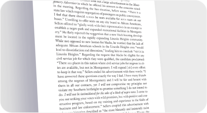 “Making a Contribution” 71 but avoided addressing specifics. None of the candidates dealt with the bus situation, which was the number-one concern on the list. Nor did any engage any of the economic problems or quality of life issues that affected 36 the daily lives of working-class and poor blacks in Montgomery. A few weeks later, Sellers took out a large advertisement in the Mont- gomery Advertiser in which he offered his answers to the concerns raised in the meeting. Regarding the bus situation, Sellers wrote: “There is a state law which requires segregation of passengers on public conveyances. I feel that there should always be seats available for Both races on our buses.” Unwilling to offer seats on any city board to African Americans, Sellers offered to “gladly work with their representatives in an attempt to establish a negro park and expanded recreational facilities in Montgom- ery.” He flatly rejected the suggestion that a new black housing develop- ment be located in the rapidly expanding Lincoln Heights community. While not opposed to new homes for blacks, he worried that the lack of adequate African American schools in the Lincoln Heights area “would neveR in lead to dissatisfaction and dissention,” leading him to conclude “ Lincoln Heights.” Regarding the request that blacks be eligible for any civil service job for which they were qualified, the candidate proclaimed: aRe places in this nation where civil service jobs for negroes in cit- “There ies are available, but not in Montgomery. I will expand [sic] every effort to keep it that way.” Sellers ended his advertisement with these words: “I have answered these questions exactly the way I feel. I have many friends among the negroes of Montgomery and I will be fair and honest with them in all our contacts, yet I will not compromise my principles nor violate my Southern birthright to promise something I do not intend to do. I will not be intimidated for the sake of a block of negro votes. I come to you not seeking your votes with wild promises, but with positive and con- structive program, based on my training and experience in the fields of business and law enforcement.” Sellers coupled this advertisement with what one historian described as “the most blatantly and insistently racist addresses heard in Montgomery since the days of J. Johnston Moore, the Ku Klux Klan’s candidate against Mayor Gunter in the 1920s.” Sellers’s commitment to a “no-compromise” approach with the city’s African Americans led him to a victory in the commission elections, as he out- 37 paced the incumbent Dave Birmingham 43 percent to 37 percent.