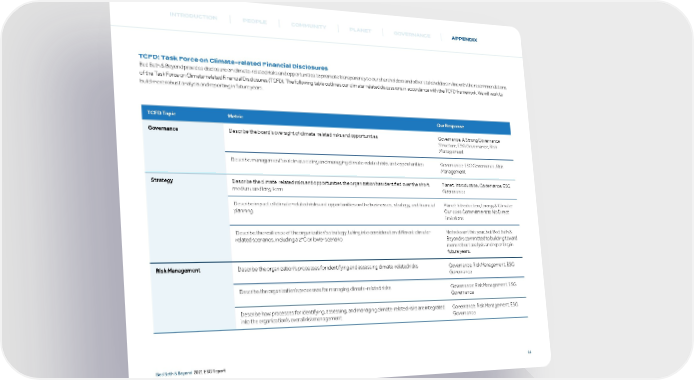 INTRODUCTION PEOPLE COMMUNITY PLANET GOVERNANCE APPENDIX TCFD: Task Force on Climate-related Financial Disclosures Bed Bath & Beyond provides disclosure on climate-related risks and opportunities to promote transparency to our shareholders and other stakeholders in line with the recommendations of the Task Force on Climate-related Financial Disclosures (TCFD). The following table outlines our climate-related discussions in accordance with the TCFD framework. We will work to build more robust analysis and reporting in future years. TCFD Topic Metric Our Response Governance Describe the board’s oversight of climate-related risks and opportunities Governance: A Strong Governance Structure, ESG Governance, Risk Management Describe management’s role in assessing and managing climate-related risks and opportunities Governance: ESG Governance, Risk Management Strategy Describe the climate-related risks and opportunities the organization has identified over the short, Planet: Introduction, Governance: ESG medium, and long term Governance Describe impact of climate-related risks and opportunities on the businesses, strategy, and financial Planet: Introduction, Energy & Climate: planning Our 2030 Commitment to No Direct Emissions Describe the resilience of the organization’s strategy, taking into consideration different climate- Not relevant this year, but Bed Bath & related scenarios, including a 2°C or lower scenario Beyond is committed to building toward more robust analysis and reporting in future years. Risk Management Describe the organization’s processes for identifying and assessing climate-related risks Governance: Risk Management, ESG Governance Describe the organization’s processes for managing climate-related risks Governance: Risk Management, ESG Governance Describe how processes for identifying, assessing, and managing climate-related risks are integrated Governance: Risk Management, ESG into the organization’s overall risk management Governance Bed Bath & Beyond 2021 ESG Report 44