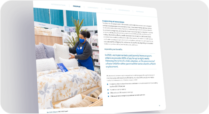 INTRODUCTION PEOPLE COMMUNITY PLANET GOVERNANCE APPENDIX supporting all associates To reflect the changing needs of all Associates and to help them succeed, we redesigned our total rewards programs to continue to invest in Associates’ financial, physical, mental, social, and emotional well-being. Our compensation packages include, but are not limited to, competitive wage rates, an annual short-term incentive program, a long-term incentive program, a 401(k) plan with matching contributions of 50% up to 6%, paid vacation and holidays, flexible time off policy, health, dental and vision insurance, paid parental leave, paid short-term disability and long-term disability insurance, life insurance, health savings and flexible spending accounts, free health and wellness subscriptions, and support via an associate relief fund. Eligibility for, and the level of, benefits vary depending on associates’ full-time or part-time status, work location, role, and tenure. expanding our benefits In 2021, we implemented a paid parental leave program, where we provide 100% of pay for up to eight weeks following the birth of a child, adoption, or the placement of a foster child for either parent within twelve months of birth or placement. We also conducted an in-depth review of our benefits programs through the lenses of diversity, equity, and inclusion and affordability. As a result of this analysis, we made a number of enhancements. Effective January 1, 2022: Provide for a flat or reduced Associate contribution to health benefits for those making less than $30,000 per year Provide for a dental subsidy Offer enhanced life insurance coverage Offer expanded coverage to opposite sex domestic partners Bed Bath & Beyond 2021 ESG Report 16