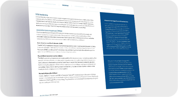 INTRODUCTION PEOPLE COMMUNITY PLANET GOVERNANCE APPENDIX DE&I leadership A robust diversity, equity, and inclusion program requires strong governance and accountability. While DE&I is Hispanic Heritage Month Fireside Chat overseen at the Board level, in 2021 we enhanced the functional management of DE&I by hiring a Senior Vice In 2021, Bed Bath & Beyond hosted a fireside chat President and Chief Diversity, Equity, and Inclusion Officer (CDEIO). Our CDEIO is responsible for developing with Juan Guerrero, our Senior Vice President and and implementing our DE&I strategy and meeting with our C-suite quarterly to ensure we embed DE&I into all Chief Supply Chain Officer; Yai Vargas, Vice President aspects of our business. The CDEIO reports directly to the Chief People and Culture Officer. Strategic Engagement & Initiatives for the Hispanic Association on Corporate Responsibility and founder associate resource groups (ARGs) of The Latinista, Inc.; and Carlos Medina, President Our Associate Resource Groups (ARGs) play a critical role in advancing a culture of diversity, equity, and and CEO of the Statewide Hispanic Chamber of inclusion across the enterprise at all levels of the organization. In 2021, we launched the Beyond Black Commerce of NJ, President of Robinson Aerial Associate Coalition and the Asian-American and Pacific Islander ARGs. In the beginning of 2022, we further Surveys, and Executive Producer & Host of the PBS expanded our ARGs from two to six to include LatinX, LGBTQ+, Well-being, and Women. Show “Que Pasa NJ.” The chat, moderated by Cristal Lambert, Corporate Counsel, Litigation, shared key Asian-American and Pacific Islander (AAPI) insights around the Hispanic/LatinX community and The AAPI ARG hosted panel discussions and awareness events in 2021, including a panel discussion on being the importance of Hispanic Heritage Month from the Asian in the Workplace with our Chief Customer Officer, Rafeh Masood, and Vijay Talwar, the former CEO of perspective of influential LatinX business leaders. Footlocker, EMEA, as well as an AAPI awareness video and listening circles to provide a safe and supportive space for our AAPI Associates to discuss the rise in Asian hate crimes. Beyond Black Associate Coalition (BBAC) The BBAC works to build awareness and create a platform for discussion. In 2021, highlights included our first annual Black History Month celebration, which focused on education and listening circles for Associates to Every year, the Human Rights Campaign (HRC) openly discuss current events such as the Derek Chauvin verdict. BBAC also led a Juneteenth celebration, releases an annual Corporate Equality Index (CEI) to facilitated ongoing education efforts to foster awareness and open dialogue, and supported a fireside chat measure corporate policies and practices related to during Black History Month with Psyche and Vontoba Terry, Founders of Urban Hydration, a black-owned LGBTQ+ workplace equality. As the nation’s foremost beauty products company and one of our suppliers. benchmarking survey, CEI rates companies based on Women’s History Month Panel the following criteria: non-discrimination policies across business entities, equitable benefits for LGBTQ+ In 2021, Deb Elam, President and CEO of Corporate Playbook™, moderated a panel discussion on being a workers and their families, supporting an inclusive woman in the workplace with female leaders in the company, including Chief People and Culture Officer Lynda culture, and corporate social responsibility. In our first Markoe and Chief Legal Officer Arlene Hong. They shared their personal and professional journeys along with year participating, Bed Bath & Beyond earned a score of tips on creating work-life harmony. 70 out of 100. We are committed to using the learnings to improve our score in 2022. Bed Bath & Beyond 2021 ESG Report 14