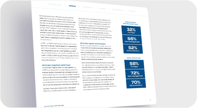INTRODUCTION PEOPLE COMMUNITY PLANET GOVERNANCE APPENDIX We also provided all time-off eligible Associates with two Including this initial investment, we raised nearly $300,000 racial and ethnic additional personal days and a Mental Health Day for our for the Stronger, Together Relief Fund, approving 97 grants diversity at each level: corporate Associates in recognition of World Mental Health totaling $84,000 in 2021. These grants included $30,000 Day. Based on the feedback Associates raised in the in the for Associates impacted by Hurricane Ida. We encourage engagement survey, we implemented a flexible time off Associates to apply for grants and make application 32% policy for 2022 to support U.S. based corporate Associates, information available through our internal communications manager supply chain, and multi-unit retail leaders. Instead of accruing and our Associate portal. All fund activities, including a limited number of paid vacation days, our flexible time off accepting donations, reviewing and approving applications, policy now allows employees to take the number of days they and awarding and distributing grants are administered by a 56% need. We also increased paid time off for eligible full-time third-party 501(c)(3) non-profit administrator. non-management hourly Associates. In 2021, our Well-being Champions Group, an Associate- diversity, equity and inclusion led cross-functional initiative, helped to provide direction We strive to be industry leaders on diversity, equity, and 52% and feedback as well as launch key programs and support inclusion (DE&I) and model a culture that is safe and built well-being events, such as virtual meditations, an Earth on trust and accountability where all Associates know they total workforce Day gardening program, and a Laughter and Mental Health belong. By building upon our recruitment, development, event. In 2022, the Well-being Champions group will evolve and promotion practices, we seek to provide equitable into an Associate Resource Group, enabling greater impact opportunities and achieve a workforce that reflects the world women at each level: across the enterprise. we live in and the consumers we serve. We monitor the representation of women and racially and 58% stronger, together relief fund ethnically diverse Associates at all levels of our organization. Our Stronger, Together Relief Fund was created in July Our goal is to focus on mid-career Associates in order to manager of 2021 as a resource for Associates facing a short-term build a bench of senior leaders that is reflective of the world financial hardship in the event of an unforeseen personal we live in and our consumer base. event or natural disaster. Associates are eligible to apply for In 2021, we took steps to educate, celebrate, and recognize 72% grants to help cover costs associated with natural disasters, DE&I, including establishing Martin Luther King Jr. Day as non-management unexpected medical expenses, impacts to Associates’ a formal Company holiday. We implemented educational homes from fires and floods, the death of an immediate programming to increase awareness, empathy, and family member, escaping domestic abuse, and epidemics. understanding. While we are proud of the steps we have 70% Bed Bath & Beyond provided an initial investment of taken to date, we recognize there is still much more we must total workforce $250,000 and a 50% match on Associate donations. do to create a sense of home for all Associates. Bed Bath & Beyond 2021 ESG Report 13