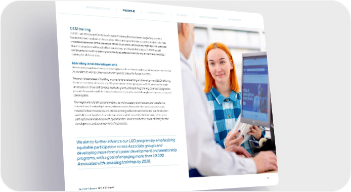 INTRODUCTION PEOPLE COMMUNITY PLANET GOVERNANCE APPENDIX DE&I training In 2021, we introduced Conscious Inclusion training for Associates, beginning with the leadership team and senior Associates. This training reinforces our policy and aims to help increase awareness of the presence of bias to position us to actively fight against potential bias in interactions with each other, customers, and key stakeholders. In 2022 we will continue to roll out this training to more Associates and aim to implement required DE&I training for all Associates. learning and development We strive to maintain an engaging workplace culture that provides upskilling opportunities for Associates as well as other tools to set up Associates for future success. We are in the process of building a comprehensive learning and development (L&D) offering to create a center of excellence. We plan to launch the program in 2022, which will include an expansion of our skill development programs and upskilling training courses designed to provide Associates with technical and competency-based skills applicable across a range of career paths. Our regional and district store leaders, as well as supply chain leaders, participate in a Foundational Leadership Course, which provides them with the tools and resources needed to lead Associates and create a strong culture in our stores and our distribution and fulfillment facilities. Our role framework, which provides the foundation for career path options and development opportunities, serves as a further point of clarity for the development and advancement of Associates. We aim to further advance our L&D program by emphasizing equitable participation across Associate groups and developing more formal career development and mentorship programs, with a goal of engaging more than 10,000 Associates with upskilling trainings by 2030. Bed Bath & Beyond 2021 ESG Report 15