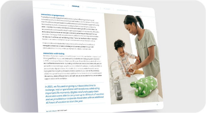 INTRODUCTION PEOPLE COMMUNITY PLANET GOVERNANCE APPENDIX associate engagement To prioritize Associate engagement and promote a culture of listening and learning, we expanded opportunities for all Associates to provide feedback over the last year. In 2021, more than 70% of Associates participated in our first enterprise-wide Associate engagement survey. We shared the results from the survey – including key themes, top strengths, and priority areas – in addition to providing next steps to continue the dialogue with our Associates. We are committed to continuous listening through regular engagement surveys every 18 months and pulse surveys to ensure we have open channels to gather frequent feedback from our associates. Our engagement survey process is in addition to other two-way communication vehicles we will continue, such as listening circles. The survey results provide an important baseline as we continue to improve our work environment to ensure Associates thrive. In our commitment to leadership transparency and keeping Associates informed, we regularly share the Company’s strategy and business updates through CEO communications, including emails, weekly bulletins, videos, and town halls. associate well-being We believe that physical and mental well-being is essential for a productive, engaged, and thriving workforce. In 2021, we continued to provide the well-being programs launched in 2020, including our Associate Assistance Program, Beyond Wellness, which offers free and confidential assessments, counseling, and other services to Associates with personal and work-related challenges, as well as a subscription to Headspace, a leading mindfulness and meditation digital platform. The results of our enterprise-wide Associate survey highlighted the competing demands placed on women in 2021. We held four listening circles throughout the year to provide a platform for our female leaders focused on work/ life harmony, stress of the pandemic, and self-care, as well as ideas for how we can better support women in the workplace. In 2021, we focused on giving our Associates time to recharge, rest or spend time with loved ones celebrating important life moments. Eligible retail and supply chain Associates were able to carry over up to 40 hours of vacation and we provided our corporate Associates with an additional 40 hours of vacation to start the year. Bed Bath & Beyond 2021 ESG Report 12