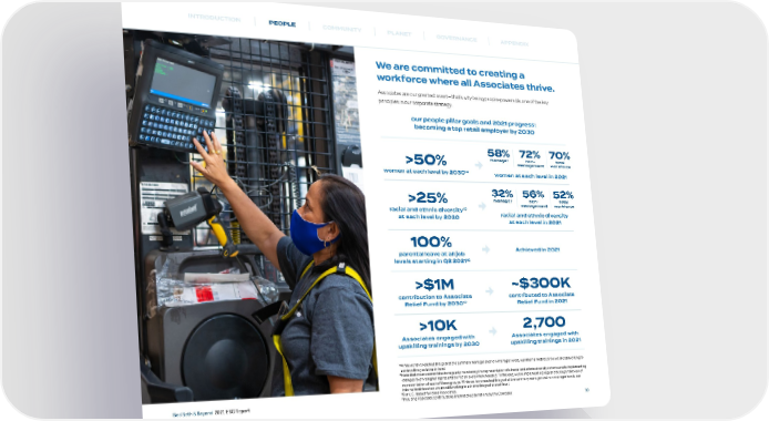 INTRODUCTION PEOPLE COMMUNITY PLANET GOVERNANCE APPENDIX We are committed to creating a workforce where all Associates thrive. Associates are our greatest asset – that’s why being people-powered is one of the key principles in our corporate strategy. our people pillar goals and 2021 progress: becoming a top retail employer by 2030 58% 72% 70% manager non- total >50% management workforce women at each level by 203014 women at each level in 2021 32% 56% 52% >25% manager non- total management workforce 15 racial and ethnic diversity racial and ethnic diversity at each level by 2030 at each level in 2021 100% Achieved in 2021 parental leave at all job levels starting in Q2 202116 >$1M ~$300K contribution to Associate contributed to Associate Relief Fund by 203017 Relief Fund in 2021 >10K 2,700 Associates engaged with Associates engaged with upskilling trainings by 2030 upskilling trainings in 2021 14 While we have reached this goal at the summary manager and non-manager levels, our internal metrics show we are still working to achieve this goal at each level. 15 Note that we are committed to regularly monitoring the representation of all racial and ethnic diversity cohorts and to implementing changes to drive higher representation at all levels where needed. To this end, we are implementing regular tracking and review of representation of each of these groups. While we have reached this goal at the summary manager and non-manager levels, our internal metrics show we are still working to achieve this goal at each level. 16 For U.S.-based full-time Associates. Bed Bath & Beyond 2021 ESG Report 17 Including Associate contributions and matched donations by the Company. 10