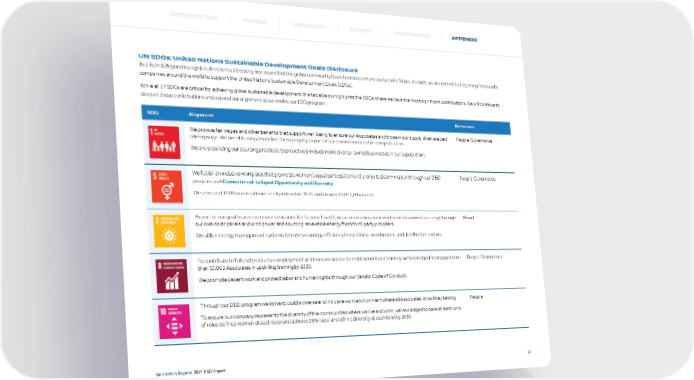 INTRODUCTION PEOPLE COMMUNITY PLANET GOVERNANCE APPENDIX UN SDGs: United Nations Sustainable Development Goals Disclosure Bed Bath & Beyond recognizes its role in addressing key issues that the global community faces to create a more sustainable future. As such, we are committed to joining forces with companies around the world to support the United Nations Sustainable Development Goals (SDGs). While all 17 SDGs are critical for achieving global sustainable development, the table below highlights the SDGs where we have the most significant contributions. We will continue to deepen these contributions and expand our alignment as we evolve our ESG program. SDG Alignment Reference We provide fair wages and other benefits that support well-being to ensure our Associates and those in our supply chain are paid People, Governance a living wage. We are obtaining a baseline for pay equity as part of our commitment to fair compensation. We are expanding our sourcing practices to proactively include more diverse-owned businesses in our supply chain. We foster an inclusive workplace that promotes women’s equal participation and prohibits discrimination through our DE&I People, Governance program and Commitment to Equal Opportunity and Diversity. We achieved 100% parental leave at all job levels in 2021 and provide LGBTQ+ benefits. As part of our goal to achieve no net emissions for Scopes 1 and 2, we are increasing our investment in renewable energy through Planet our own solar panels and wind power and sourcing renewable energy from third-party providers. We utilize energy management systems to improve energy efficiency in our stores, warehouses, and distribution centers. To contribute to full and productive employment and increase access to employment and training, we’ve pledged to engage more People, Governance than 10,000 Associates in upskilling training by 2030. We promote decent work and protect labor and human rights through our Vendor Code of Conduct. Through our DE&I program we strive to build a diverse and inclusive work environment where all Associates know they belong. People To ensure our company represents the diversity of the communities where we live and work, we’ve pledged to have at least 50% of roles be filled women at each level and achieve 25% racial and ethnic diversity at each level by 2030. Bed Bath & Beyond 2021 ESG Report 42