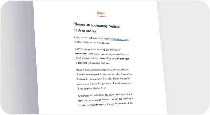 BENCH SMALL BUSINESS GUIDES Step 3. Choose an accounting method: cash or accrual It’s important to choose either a cash or accrual accounting method before you start your books. If you’re using cash accounting, you only record transactions when money has exchanged hands. So if you billed a customer today, those dollars wouldn’t enter your ledger until the customer paid you. Using the accrual accounting method, you would record the income when you bill the customer, rather than waiting for them to pay you. So at the end of the tax year, you’ve recorded all income that you earned during that year, even if you haven’t collected it yet. Same goes for deductions. You deduct them when you’re billed, not when you pay. If your company has inventory, in most cases you’ll be expected to use the accrual method. 9