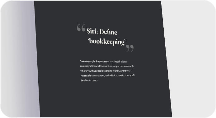 BENCH SMALL BUSINESS GUIDES Siri: Define ‘bookkeeping’ Bookkeeping is the process of tracking all of your company’s financial transactions, so you can see exactly where your business is spending money, where your revenue is coming from, and which tax deductions you’ll be able to claim. 3