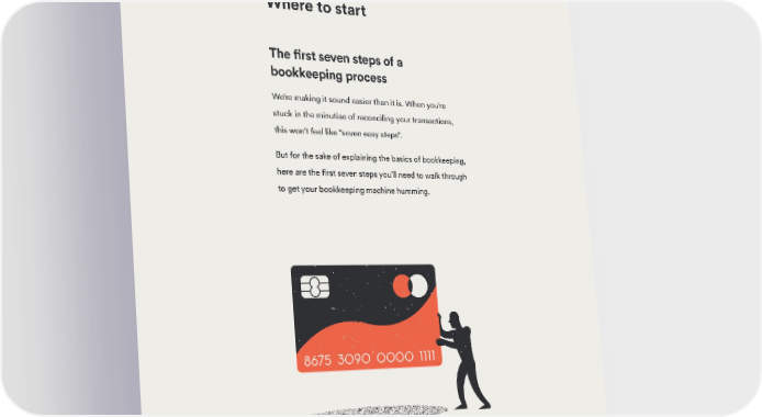 BENCH SMALL BUSINESS GUIDES Where to start The first seven steps of a bookkeeping process We’re making it sound easier than it is. When you’re stuck in the minutiae of reconciling your transactions, this won’t feel like “seven easy steps”. But for the sake of explaining the basics of bookkeeping, here are the first seven steps you’ll need to walk through to get your bookkeeping machine humming. 6