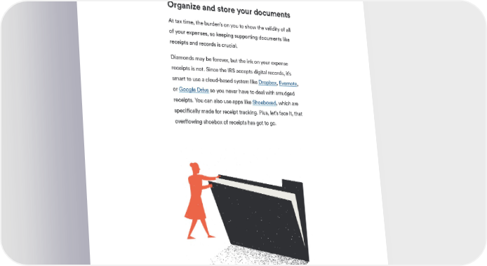 BENCH SMALL BUSINESS GUIDES Step 5. Organize and store your documents At tax time, the burden’s on you to show the validity of all of your expenses, so keeping supporting documents like receipts and records is crucial. Diamonds may be forever, but the ink on your expense receipts is not. Since the IRS accepts digital records, it’s smart to use a cloud-based system like Dropbox, Evernote, or Google Drive so you never have to deal with smudged receipts. You can also use apps like Shoeboxed, which are specifically made for receipt tracking. Plus, let’s face it, that overflowing shoebox of receipts has got to go. 11