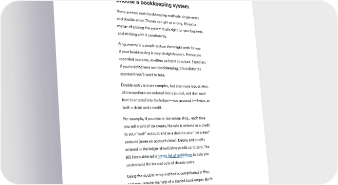 BENCH SMALL BUSINESS GUIDES Step 2. Choose a bookkeeping system There are two main bookkeeping methods: single-entry, and double-entry. There’s no right or wrong, it’s just a matter of picking the system that’s right for your business, and sticking with it consistently. Single-entry is a simple system that might work for you if your bookkeeping is very straightforward. Entries are recorded one time, as either an input or output. Especially if you’re doing your own bookkeeping, this is likely the approach you’ll want to take. Double-entry is more complex, but also more robust. First, all transactions are entered into a journal, and then each item is entered into the ledger—you guessed it—twice, as both a debit and a credit. For example, if you own an ice cream shop, each time you sell a pint of ice cream, the sale is entered as a credit to your “cash” account and as a debit to your “ice cream” account (more on accounts later). Debits and credits entered in the ledger should always add up to zero. The IRS has published a handy list of guidelines to help you understand the ins and outs of double-entry. Using the double-entry method is complicated at first, and may require the help of a trained bookkeeper. But it will give you more accurate books overall. Think of it like double-checking your answers before you hand in a math test. 8