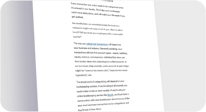 BENCH SMALL BUSINESS GUIDES Step 4. Categorize your transactions Every transaction you make needs to be categorized when it’s entered in your books. This helps your bookkeeper catch more deductions, and will make your life easier if you get audited. Six months later, an unmarked receipt for lunch at a restaurant might not mean much to you. Was it a client lunch? Did you treat your employees after a successful quarter? The way you categorize transactions will depend on your business and industry. Generally speaking, your transactions fall into five account types—assets, liabilities, equity, revenue, and expenses. Individual line items are then broken down into subcategories called accounts. In our ice cream shop example, some accounts in your ledger might be “revenue-ice cream sales”, “expenses-ice cream ingredients”, etc. The actual work of categorizing will depend on your bookkeeping solution. If you’re doing it all yourself, you could make a note on each receipt. If you’re using an online bookkeeping service like Bench, you’ll just have a conversation with your bookkeeper about how you’d like your most common transactions to be categorized, and they’ll take it from there. If you’re going to be doing your own bookkeeping, it’s worth talking to a pro when you set up your system, to make sure the accounts you create align with your industry standards and CPA expectations. 10