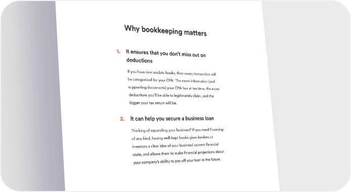 BENCH SMALL BUSINESS GUIDES Why bookkeeping matters 1. It ensures that you don’t miss out on deductions If you have immaculate books, then every transaction will be categorized for your CPA. The more information (and supporting documents) your CPA has at tax time, the more deductions you’ll be able to legitimately claim, and the bigger your tax return will be. 2. It can help you secure a business loan Thinking of expanding your business? If you need financing of any kind, having well-kept books gives lenders or investors a clear idea of your business’ current financial state, and allows them to make financial projections about your company’s ability to pay off your loan in the future. 4