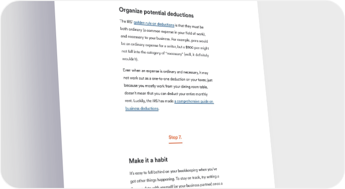 BENCH SMALL BUSINESS GUIDES Step 6. Organize potential deductions The IRS’ golden rule on deductions is that they must be both ordinary (a common expense in your field of work), and necessary to your business. For example, pens would be an ordinary expense for a writer, but a $900 pen might not fall into the category of “necessary” (well, it definitely wouldn’t). Even when an expense is ordinary and necessary, it may not work out as a one-to-one deduction on your taxes; just because you mostly work from your dining room table, doesn’t mean that you can deduct your entire monthly rent. Luckily, the IRS has made a comprehensive guide on business deductions. Step 7. Make it a habit It’s easy to fall behind on your bookkeeping when you’ve got other things happening. To stay on track, try setting a finance date with yourself (or your business partner) once a month to get it done. If you do happen to fall behind, Bench can help you get caught up in no time. 12