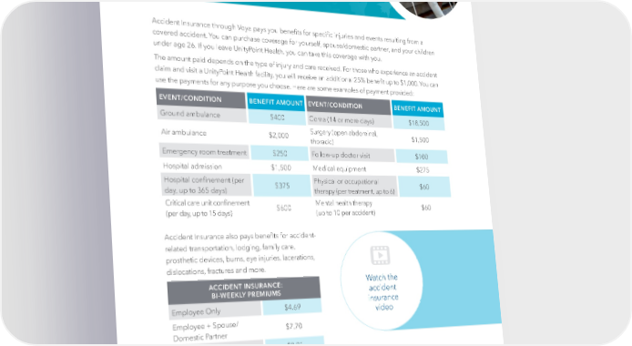 Accident Insurance Accident Insurance through Voya pays you bene昀椀ts for speci昀椀c injuries and events resulting from a covered accident. You can purchase coverage for yourself, spouse/domestic partner, and your children under age 26. If you leave UnityPoint Health, you can take this coverage with you. The amount paid depends on the type of injury and care received. For those who experience an accident claim and visit a UnityPoint Health facility, you will receive an additional 25% bene昀椀t up to $1,000. You can use the payments for any purpose you choose. Here are some examples of payment provided: EVENT/CONDITION BENEFIT AMOUNT EVENT/CONDITION BENEFIT AMOUNT Ground ambulance $400 Coma (14 or more days) $18,500 Air ambulance $2,000 Surgery (open abdominal, $1,500 thoracic) Emergency room treatment $250 Follow-up doctor visit $100 Hospital admission $1,500 Medical equipment $275 Hospital con昀椀nement (per $375 Physical or occupational $60 day, up to 365 days) therapy (per treatment, up to 6) Critical care unit con昀椀nement $600 Mental health therapy $60 (per day, up to 15 days) (up to 10 per accident) Accident Insurance also pays bene昀椀ts for accident- related transportation, lodging, family care, prosthetic devices, burns, eye injuries, lacerations, dislocations, fractures and more. ACCIDENT INSURANCE: Watch the BI-WEEKLY PREMIUMS accident Employee Only $4.69 insurance video Employee + Spouse/ $7.70 Domestic Partner Employee + Child(ren) $8.91 Family $11.92 WELLNESS BENEFIT Your coverage also includes accidental death The plan also pays a wellness bene昀椀t and dismemberment bene昀椀ts. If you are severely of $50 once per calendar year for injured or pass away due to an accident additional each family member enrolled when bene昀椀ts may apply. an eligible health screening test is completed. For more information, review the Wellness Bene昀椀t Claims Checklist & FAQ. | 28 |
