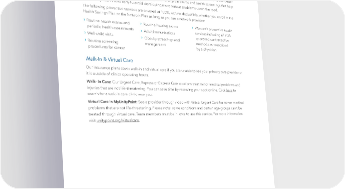 Health Insurance, continued Preventive Care Bene昀椀ts Working in health care, we know how adopting a healthy lifestyle can help us stay well and live better. Therefore, it is important that you periodically receive physical exams and health screenings that help you identify health risks early to avoid developing more serious problems down the road. The following preventive services are covered at 100%, with no deductible, whether you enroll in the Health Savings Plan or the Network Plan as long as you see a network provider: › › › Routine health exams and Routine hearing exams Women’s preventive health periodic health assessments › services including all FDA Adult immunizations › approved contraceptive Well-child visits › Obesity screenings and methods as prescribed › Routine screening management by a physician procedures for cancer Walk-In & Virtual Care Our insurance plans cover walk-in and virtual care if you are unable to see your primary care provider or it is outside of clinics operating hours. Walk- In Care: Our Urgent Care, Express or Express Care locations treat minor medical problems and injuries that are not life-threatening. You can save time by reserving your spot online. Click here to search for a walk-in care clinic near you. Virtual Care in MyUnityPoint: See a provider through video with Virtual Urgent Care for minor medical problems that are not life-threatening. Please note: some conditions and certain age groups can’t be treated through virtual care. Team members must be in Iowa to use this service. For more information visit unitypoint.org/virtualcare. | 6 |