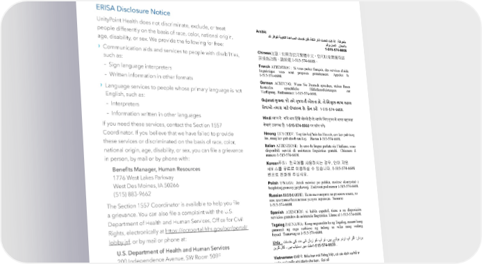 Availability of Summary Health Information UnityPoint Health offers two medical plans. As required by Patient Protection and Affordable Care Act, your plan makes available a Summary of Bene昀椀ts and Coverage (SBC) for each option. The SBCs can be found at the HR landing page on the Hub. You can also request a paper copy, free of charge, by contacting AskHR ERISA Disclosure Notice UnityPoint Health does not discriminate, exclude, or treat Arabic ERISA Disclosure Notice people differently on the basis of race, color, national origin, ك ﻟ ر ﻓ ا و ﺗ ﺗ ﺔ ﯾ و ﻐ ﻠ ﻟ ا ة د ﻋ ﺎ ﺳ ﻣ ﻟ ا ت ﺎ ﻣ د ﺧ ن ﺈ ﻓ ، ﺔ ﻐ ﻠ ﻟ ا ر ﻛ ذ ا ث د ﺣ ﺗ ﺗ ت ﻧ ﻛ ا ذ إ : ﺔ وظ ﺣ ﻠ ﻣ م ﻗ ر ﺑ ﺻل ﺗ ا . ن ﺎ ﻣﺟ ﻟ ﺎ ﺑ UnityPoint Health does not discriminate, exclude, or age, disability, or sex. We provide the following for free: 1-515-574-6608 treat people differently on the basis of race, color, 注意:如果您使用繁體中文,您可以免費獲得語 Chinese › national origin, age, disability, or sex. We provide the C ommunication aids and services to people with disabilities, 言援助服務。請致電 1-515-574-6608。 such as: following for free: • Communication aids and services to people with French ATTENTION : Si vous parlez français, des services d’aide – Sign language interpreters linguistique vous sont proposés gratuitement. Appelez le disabilities, such as: o Sign language interpreters 1-515-574-6608. – Written information in other formats German ACHTUNG: Wenn Sie Deutsch sprechen, stehen Ihnen › o Written information in other formats kostenlos sprachliche Hilfsdienstleistungen zur Language services to people whose primary language is not Verfügung. Rufnummer: 1-515-574-6608. English, such as: • Language services to people whose primary ુ ુ ુ Gujarati !ચના: જો તમે -જરાતી બોલતા હો, તો િન:56ક ભાષા સહાય language is not English, such as: ? – Interpreters o Interpreters સેવાઓ તમારા માટ ઉપલBધ છે. ફોન કરો 1-515-574-6608. – Information written in other languages o Information written in other languages Hindi !यान द': य)द आप ,हदं ी बोलते ह 5 तो आपके िलए मु;त म' भाषा सहायता If you need these services, contact the Section 1557 सेवाएं उपलAध ह।5 1-515-574-6608 पर कॉल कर'। If you need these services, contact the Grievance Coordinator. If you believe that we have failed to Coordinator. If you believe that we have failed to provide Hmong LUS CEEV: Yog tias koj hais lus Hmoob, cov kev pab txog lus, muaj kev pab dawb rau koj. Hu rau 1-515-574-6608. provide these services or discriminated on the basis these services or discriminated on the basis of race, color, Italian ATTENZIONE: In caso la lingua parlata sia l’italiano, sono of race, color, national origin, age, disability, or sex, national origin, age, disability, or sex, you can 昀椀le a grievance disponibili servizi di assistenza linguistica gratuiti. Chiamare il you can file a grievance in person, by mail or by in person, by mail or by phone with: numero 1-515-574-6608. phone with: 주의: 한국어를 사용하시는 경우, 언어 지원 Korean Bene昀椀ts Manager, Human Resources 서비스를 무료로 이용하실 수 있습니다. 1-515-574-6608 Benefits Manager, Human Resources 1776 West Lakes Parkway 번으로 전화해 주십시오. 1776 West Lakes Parkway West Des Moines, IA 50266 Polish UWAGA: Jeżeli mówisz po polsku, możesz skorzystać z West Des Moines, IA 50266 (515) 883-9662 bezpłatnej pomocy językowej. Zadzwoń pod numer 1-515-574-6608. (515) 883-9662 Russian ВНИМАНИЕ: Если вы говорите на русском языке, то The Section 1557 Coordinator is available to help you 昀椀le вам доступны бесплатные услуги перевода. Звоните 1-515-574-6608. The Grievance Coordinator is available to help you a grievance. You can also 昀椀le a complaint with the U.S. file a grievance. You can also file a complaint with the Spanish ATENCIÓN: si habla español, tiene a su disposición Department of Health and Human Services, Of昀椀ce for Civil servicios gratuitos de asistencia lingüística. Llame al 1-515-574-6608. U.S. Department of Health and Human Services, Office Tagalog PAUNAWA: Kung nagsasalita ka ng Tagalog, maaari kang for Civil Rights, electronically at Rights, electronically at https://ocrportal.hhs.gov/ocr/portal/ gumamit ng mga serbisyo ng tulong sa wika nang walang https://ocrportal.hhs.gov/ocr/portal/lobby.jsf, or by lobby.jsf, or by mail or phone at: bayad. Tumawag sa 1-515-574-6608. mail or phone at: ت ﺎ ﻣ د ﺧ ﯽ ﮐ د د ﻣ ﯽ ﮐ ن ﺎ ﺑ ز و ﮐ پ آ و ﺗ ، ں ﯾ ﮨ ﮯ ﺗ ﻟ و ﺑ و د ر ا پ آ ر ﮔ ا : ر ا رد ﺑ U.S. Department of Health and Human Services Urdu . ﯾں ر ﮐ ل ﺎ ﮐ ۔ ﯾں ﮨ ب ﺎ ﯾ ﺗ ﺳ د ﯾں ﻣ ت ﻔ ﻣ 1-515-574-6608 . 200 Independence Avenue, SW Room 509F Vietnamese CHÚ Ý: Nếu bạn nói Tiếng Việt, có các dịch vụ hỗ trợ HHH Building U.S. Department of Health and Human Services 200 ngôn ngữ miễn phí dành cho bạn. Gọi số Independence Avenue, SW Room 509F, Washington, D.C. 20201 1-515-574-6608. HHH Building 1-800-368-1019 | 1-800-537-7697 (TDD) Washington, D.C. 20201 Complaint forms are available at 1-800-368-1019, http://www.hhs.gov/ocr/of昀椀ce/昀椀le/index.html 1-800-537-7697 (TDD) Complaint forms are available at http://www.hhs.gov/ocr/office/file/index.html | 48 |