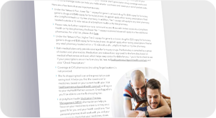 Health Insurance, continued About Your Medical Plan’s Prescription Drug Coverage If you take any medications regularly, prescription drug costs can add up to a signi昀椀cant part of your overall health care expenses. Knowing how your medical plan’s prescription drug coverage works and what to do to manage costs can help you make smarter purchases and lower your out-of-pocket costs. Here are a few items that are important to note: › Under the Network Plan, lower Tier 1 copays for generic or brand drug 昀椀lls ($10 copay for formulary generic drugs and $40 copay for formulary brand drugs) will apply when having prescriptions 昀椀lled at a UnityPoint Health or Hy-Vee pharmacy. In addition, Tier 1 copays will apply to any retail pharmacy located outside a 15 mile radius of a UnityPoint Health or Hy-Vee pharmacy. › Please note, to further support our rural communities and those with limited access to a UnityPoint Health or Hy-Vee pharmacy, the lower Tier 1 copays explained above will apply to a few additional pharmacies. For a full list, please click here. › Under the Network Plan, higher Tier 2 copays for generic or brand drug 昀椀lls ($20 copay for formulary generic drugs and $50 copay for formulary brand drugs) will apply when having prescriptions 昀椀lled at any retail pharmacy located within a 15 mile radius of a UnityPoint Health or Hy-Vee pharmacy. › Both medical plans only provide coverage for formulary drugs. The formulary is compiled by a group of doctors and pharmacists. Medications are reviewed and approved for the formulary based on medical effectiveness and cost, which helps keep costs affordable for you. If you’d like to check to see if your prescriptions are on the formulary list, head to healthpartnersunitypointhealth.com/uph and click “Check Prescriptions.” › Coverage at CVS pharmacies (including Target locations) is not provided. › The Rx shopping tool is an online prescription cost- saving tool. It helps you 昀椀nd the lowest cost for medicines, based on your current health plan. Visit healthpartnersunitypointhealth.com/uph and log on to your myHealthPartners account. Once logged on, you’ll be able to use the Rx shopping tool. › A UnityPoint Health Medication Therapy Management (MTM) pharmacist can help you focus on your medicines to make sure they are a good 昀椀t for you and your health conditions. Your personal pharmacist will work with you and your care team to check that your medicines, doses, and schedules meet your needs. Your pharmacist will also make sure that your drugs work well together and aren’t causing side effects. Visits can often be provided by phone or video conference, making them easier to 昀椀t into your schedule. Working with a pharmacist on a regular basis might also save you money on your medicine copays. | 11 |