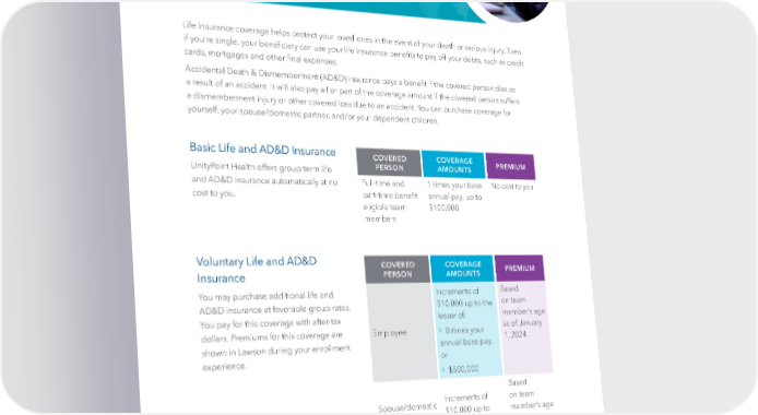 Life and Accidental Death & Dismemberment Insurance Life insurance coverage helps protect your loved ones in the event of your death or serious injury. Even if you’re single, your bene昀椀ciary can use your life insurance bene昀椀ts to pay off your debts, such as credit cards, mortgages and other 昀椀nal expenses. Accidental Death & Dismemberment (AD&D) insurance pays a bene昀椀t if the covered person dies as a result of an accident. It will also pay all or part of the coverage amount if the covered person suffers a dismemberment injury or other covered loss due to an accident. You can purchase coverage for yourself, your spouse/domestic partner, and/or your dependent children. Basic Life and AD&D Insurance COVERED COVERAGE PERSON AMOUNTS PREMIUM UnityPoint Health offers group term life and AD&D insurance automatically at no Full-time and 1 times your base No cost to you cost to you. part-time bene昀椀t annual pay, up to eligible team $100,000 members Voluntary Life and AD&D COVERED COVERAGE Insurance PERSON AMOUNTS PREMIUM You may purchase additional life and Increments of Based AD&D insurance at favorable group rates. $10,000 up to the on team You pay for this coverage with after-tax lesser of: member’s age dollars. Premiums for this coverage are Employee › 8 times your as of January shown in Lawson during your enrollment annual base pay, 1, 2024 experience. or › $500,000 Based Spouse/domestic Increments of on team partner $10,000 up to member’s age $100,000 as of January REVIEW & UPDATE 1, 2024 Flat amount Flat rate no Review and update your Children (up to of $5,000 or matter how bene昀椀ciaries with Prudential at age 26) $10,000 per child many children prudential.com/mybene昀椀ts are covered | 22 |