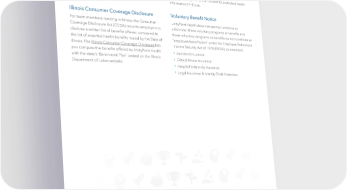 Marketplace Notice Notice of Privacy Practices The Patient Protection and Affordable Care Act (ACA) The HIPAA Privacy Rule requires groups offering certain requires employers to provide team members with a health bene昀椀t plans to develop and distribute a Notice written notice informing them of the existence of the of Privacy Practices (NPPs). The Notice of Privacy Practices Marketplace, including a description of the services must describe how the covered entity may and may not provided by the Marketplace. The Marketplace Notice use protected health information (PHI) and what your also lets you know how you may contact the Marketplace rights and obligations with respect to protected health to request assistance. information (PHI) are. Illinois Consumer Coverage Disclosure Voluntary Bene昀椀t Notice For team members residing in Illinois, the Consumer UnityPoint Health does not sponsor, endorse or Coverage Disclosure Act (CCDA) requires employers to administer these voluntary programs or bene昀椀ts and disclose a written list of bene昀椀ts offered compared to these voluntary programs or bene昀椀ts do not constitute an the list of essential health bene昀椀ts issued by the State of “employee bene昀椀t plan” under the Employee Retirement Illinois. The Illinois Consumer Coverage Disclosure lets Income Security Act of 1974 (ERISA), as amended. you compare the bene昀椀ts offered by UnityPoint Health › Accident Insurance with the state’s ‘Benchmark Plan’ posted on the Illinois › Critical Illness Insurance Department of Labor website. › Hospital Indemnity Insurance › L egal Insurance & Identity Theft Protection | 50 |