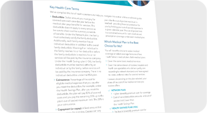 Health Insurance Key Health Care Terms We’ve compiled this list of health care terms to help you navigate this section of the enrollment guide: › year after the out-of-pocket maximum is Deductible: Dollar amount you must pay for covered care each calendar year before the reached - providing 昀椀nancial protection for medical plan pays bene昀椀ts for services. The you by limiting your out-of-pocket expenses in deductible doesn’t apply to every service so a given calendar year. The out-of-pocket limit be sure to check out the summary schedule is a combined amount for both medical and of bene昀椀ts. Under the Network plan, the family prescription coverage under each medical plan. must collectively satisfy the family deductible. Additionally, each family member has an Which Medical Plan is the Best individual deductible in addition to the overall Choice for Me? family deductible. Meaning if an individual in You will have the choice to waive medical the family reaches his or her deductible before coverage or select coverage from one of two the family deductible is reached, his or her HealthPartners medical plans. Both medical plans: services will be paid by the insurance company. › Under the Health Savings plan (HSA), the family Cover the same basic medical services deductible must be reached, either by an › C over the same network of doctors, hospitals and individual or by the family, before services will health care specialists who deliver quality care be paid by the insurance company. There is no according to network standards and have agreed individual deductible under the HSA plan. to lower, preferred rates for covered services. › Coinsurance: Percentage of the cost for However, depending on the plan selected, your eligible medical expenses that you pay after share of the cost of the medical services you you meet the deductible. For example, under receive differs. the Health Savings Plan, after you meet the NETWORK PLAN deductible, the plan will pay 80% of covered › Higher biweekly pr emium cost for coverage costs and you pay the remaining 20% up to the › C ost of care (deductible amounts and out-of plan’s out-of-pocket maximum limit. The 20% is your coinsurance. pocket limit) lower than › the Health Savings Plan Copayment (or copay): A 昀椀xed amount that HEALTH SAVINGS PLAN (HSA) you must pay for a service. Copays can vary depending on the service you receive. › P ay less in biweekly premium cost for › coverage Network Providers: Providers who have agreed › C ost of care (deductible amounts and out-of- to lower rates for services. The UnityPoint Health pocket limit) will be higher than the Network medical plans provide bene昀椀ts for covered Plan services provided by network providers. › › UnityP oint Health contributes to your Health Out-of-Pocket Maximum (OOPM): Maximum Savings Account to help offset out-of-pocket dollar amount that you pay for eligible expenses costs in a calendar year. The plan pays 100% of eligible expenses for the rest of the calendar | 5 |