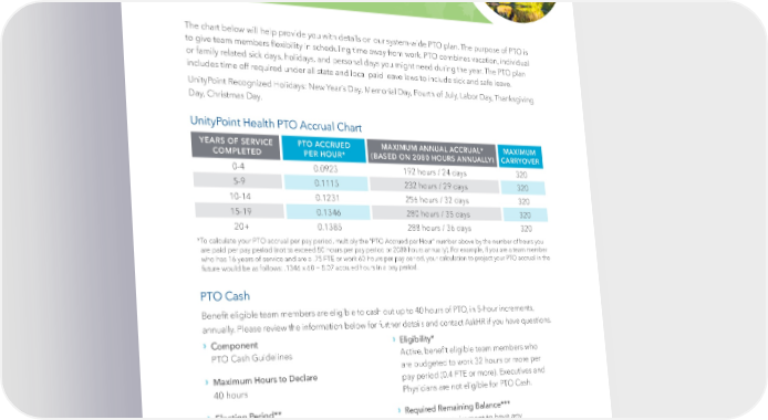 Paid Time Off (PTO) The chart below will help provide you with details on our system-wide PTO plan. The purpose of PTO is to give team members 昀氀exibility in scheduling time away from work. PTO combines vacation, individual or family related sick days, holidays, and personal days you might need during the year. The PTO plan includes time off required under all state and local paid leave laws to include sick and safe leave. UnityPoint Recognized Holidays: New Year’s Day, Memorial Day, Fourth of July, Labor Day, Thanksgiving Day, Christmas Day. UnityPoint Health PTO Accrual Chart YEARS OF SERVICE PTO ACCRUED MAXIMUM ANNUAL ACCRUAL* MAXIMUM COMPLETED PER HOUR* (BASED ON 2080 HOURS ANNUALLY) CARRYOVER 0-4 0.0923 192 hours / 24 days 320 5-9 0.1115 232 hours / 29 days 320 10-14 0.1231 256 hours / 32 days 320 15-19 0.1346 280 hours / 35 days 320 20+ 0.1385 288 hours / 36 days 320 * To calculate your PTO accrual per pay period, multiply the “PTO Accrued per Hour” number above by the number of hours you are paid per pay period (not to exceed 80 hours per pay period or 2080 hours annually). For example, if you are a team member who has 16 years of service and are a .75 FTE or work 60 hours per pay period, your calculation to project your PTO accrual in the future would be as follows: .1346 x 60 = 8.07 accrued hours in a pay period. PTO Cash Bene昀椀t eligible team members are eligible to cash out up to 40 hours of PTO, in 5-hour increments, annually. Please review the information below for further details and contact AskHR if you have questions. › › Component Eligibility* PTO Cash Guidelines Active, bene昀椀t eligible team members who › are budgeted to work 32 hours or more per Maximum Hours to Declare pay period (0.4 FTE or more). Executives and 40 hours Physicians are not eligible for PTO Cash. › Election Period** › Required Remaining Balance*** During Open Enrollment There is no requirement to have any › remaining balance in your PTO account after Payout Dates the cash out occurs. Announced during the annual open enrollment period * In order to receive a PTO Cash election, you must be an active, bene昀椀t eligible team member at the time of the payout. Executives and Physicians are not eligible for PTO Cash. ** PTO cash elections can only be made within the election period. You will not be able to make changes, including cancellation, to your PTO cash election(s) outside of the election period. *** While there is no required remaining balance, if you elect to cash out more hours than you have in your bank at the time of the payout dates, you will not receive the full elected cash-out amount. Instead, your payout will be reduced to the number hours in your bank at the time of the payout. | 36 |