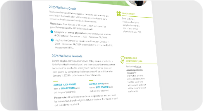 OnPoint for Health: Wellness Credit and Wellness Rewards 2025 Wellness Credit DID YOU KNOW? Team members and their spouses or domestic partners who are Both UnityPoint enrolled in the health plan will have two opportunities to earn Health medical plans rewards – A wellness credit and a wellness reward. completely cover the Please note: New hires as of October 1, 2024 and on will be cost of your annual grandfathered into the 2025 Wellness Credit. physical with your PCP. 1 Complete an annual physical with your primary care provider (PCP) between December 1, 2023 - November 30, 2024. 2 Log into the OnPoint for Health portal between October 1, 2024 - December 20, 2024 to complete the online Health Risk Assessment (HRA). 2024 Wellness Rewards HEALTH RISK Bene昀椀t-eligible team members (even if they are not enrolled in a ASSESSMENT (HRA UnityPoint Health medical plan) and their spouse/domestic partner Review the Notice (who must be enrolled in a UnityPoint Health medical plan) can Regarding Wellness earn points by completing challenges that will be available after Program for January 1, 2024 in order to earn 昀椀nancial rewards. information on what will be collected, how ACHIEVE 1,500 POINTS ACHIEVE 3,000 points it will be used, who earn a $100 REWARD paid earn a $150 REWARD paid will receive it and what out on your paycheck out on your paycheck will be done to keep it con昀椀dential. Please note: All wellness rewards are subject to tax and you must be in an active, bene昀椀t-eligible status at the time the reward is paid out in order to receive it. * Eligibility for these rewards will be reviewed on a monthly basis between February and December 2024. The 昀椀nancial reward will be paid out by the 2nd paycheck of the following month in which the point total is achieved. | 39 |