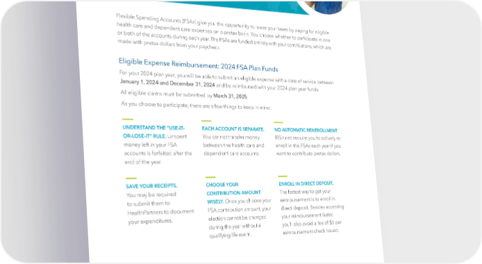 Flexible Spending Accounts (FSA) Flexible Spending Accounts (FSAs) give you the opportunity to lower your taxes by paying for eligible health care and dependent care expenses on a pretax basis. You choose whether to participate in one or both of the accounts during each year. The FSAs are funded entirely with your contributions, which are made with pretax dollars from your paycheck. Eligible Expense Reimbursement: 2024 FSA Plan Funds For your 2024 plan year, you will be able to submit an eligible expense with a date of service between January 1, 2024 and December 31, 2024 and be reimbursed with your 2024 plan year funds. All eligible claims must be submitted by March 31, 2025. As you choose to participate, there are a few things to keep in mind: UNDERSTAND THE “USE-IT- EACH ACCOUNT IS SEPARATE. NO AUTOMATIC RENEROLLMENT OR-LOSE-IT” RULE. Unspent You cannot transfer money IRS rules require you to actively re- money left in your FSA between the health care and enroll in the FSAs each year if you accounts is forfeited after the dependent care accounts. want to contribute pretax dollars. end of the year. SAVE YOUR RECEIPTS. CHOOSE YOUR ENROLL IN DIRECT DEPOSIT. You may be required CONTRIBUTION AMOUNT The fastest way to get your to submit them to WISELY. Once you choose your reimbursement is to enroll in HealthPartners to document FSA contribution amount, your direct deposit. Besides accessing your expenditures. election cannot be changed your reimbursement faster, during the year without a you’ll also avoid a fee of $5 per qualifying life event. reimbursement check issued. | 19 |