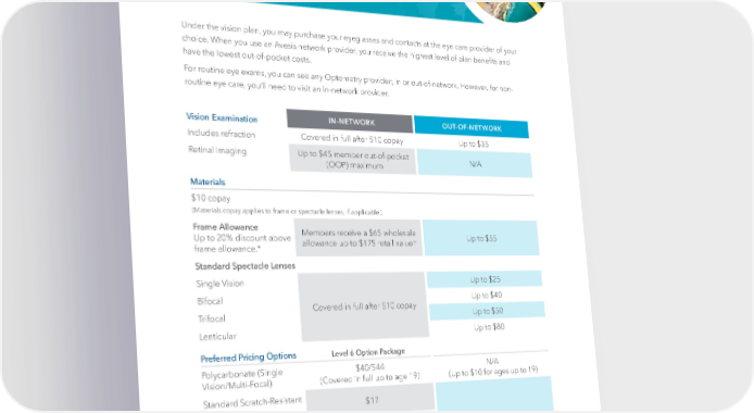 Vision Insurance Under the vision plan, you may purchase your eyeglasses and contacts at the eye care provider of your choice. When you use an Avesis network provider, you receive the highest level of plan bene昀椀ts and have the lowest out-of-pocket costs. For routine eye exams, you can see any Optometry provider; in or out-of-network. However, for non- routine eye care, you’ll need to visit an in-network provider. Vision Examination IN-NETWORK OUT-OF-NETWORK Includes refraction Covered in full after $10 copay Up to $35 Retinal Imaging Up to $45 member out-of-pocket N/A (OOP) maximum Materials $10 copay (Materials copay applies to frame or spectacle lenses, if applicable.) Frame Allowance Members receive a $65 wholesale Up to 20% discount above allowance up to $175 retail value† Up to $55 frame allowance.* Standard Spectacle Lenses Single Vision Up to $25 Bifocal Up to $40 Covered in full after $10 copay Trifocal Up to $50 Lenticular Up to $80 Preferred Pricing Options Level 6 Option Package Polycarbonate (Single $40/$44 N/A Vision/Multi-Focal) (Covered in full up to age 19) (Up to $10 for ages up to 19) Standard Scratch-Resistant $17 Coating Ultraviolet Screening $15 Solid or Gradient Tint $17 N/A Standard Anti-Re昀氀ective $45 Coating † Value may be less depending on the providers retail pricing. * Discounts are not insured bene昀椀ts. ‡ Enhanced bene昀椀t for certain conditons. ¥ Save up to 25% on average LASIK prices when you use Qualsight (visit qualsight.com/-avesis for more information). | 17 |