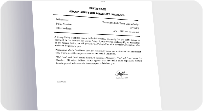 STANDARD INSURANCE COMPANY A Stock Life Insurance Company 900 SW Fifth Avenue Portland, Oregon 97204-1282 (503) 321-7000 CERTIFICATE GROUP LONG TERM DISABILITY INSURANCE Policyholder: Washington State Health Care Authority Policy Number: 377661-B Effective Date: July 1, 1992 and as amended A Group Policy has been issued to the Policyholder. We certify that you will be insured as provided by the terms of the Group Policy. If your coverage is changed by an amendment to the Group Policy, we will provide the Policyholder with a revised Certificate or other notice to be given to you. Possession of this Certificate does not necessarily mean you are insured. You are insured only if you meet the requirements set out in this Certificate. "We", "us" and "our" mean Standard Insurance Company. "You" and "your" mean the Member. All other defined terms appear with the initial letter capitalized. Section headings, and references to them, appear in boldface type. GC190-LTD 377661-B SI 22516 (8/22)