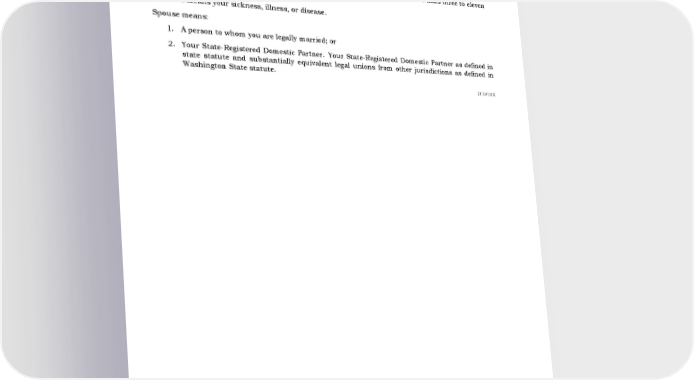 Pregnancy means your pregnancy, childbirth, or related medical conditions, including complications of pregnancy. Prior Plan means your Employer's group long term disability insurance plan in effect on the day before the effective date of your Employer's coverage under the Group Policy and which is replaced by the Group Policy. Season means any recurring, annual period of work at a specific time of year that lasts three to eleven consecutive months. Sickness means your sickness, illness, or disease. Spouse means: 1. A person to whom you are legally married; or 2. Your State-Registered Domestic Partner. Your State-Registered Domestic Partner as defined in state statute and substantially equivalent legal unions from other jurisdictions as defined in Washington State statute. LT.DF.01X 377661-B - 24 6/29/2022