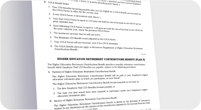 COST OF LIVING ADJUSTMENT BENEFIT A. Eligibility You are eligible for a COLA Benefit if, on each March 1, you have received Employee-Paid LTD Benefits for at least 3 of the preceding 12 months. If you have not received Employee-Paid LTD Benefits for at least 3 of the 12 months preceding March 1, you are eligible for COLA Benefits on the following March 1, provided you have received Employee- Paid LTD Benefits for at least 3 of the 12 months preceding such March 1. B. COLA Benefit Rules 1. Your LTD Benefits becoming payable after you are eligible for a COLA Benefit are increased by the COLA Factor in effect for the current year. 2. A new COLA Factor is determined each March 1. 3. Your first COLA Factor is equal to 1.00 plus one-half the rate of increase in the CPI-W for the prior calendar year. 4. Each following COLA Factor is equal to 1.00 plus one-half the rate of increase in the CPI-W for the prior calendar year, times the previous COLA Factor. 5. The maximum increase that we will use is 6%. 6. The Minimum LTD Benefit is not adjusted by the COLA Factor. 7. Your COLA Factor will not decrease, even if the CPI-W decreases. 8. The COLA Benefit does not apply to Retirement Supplement or Higher Education Retirement Contributions Benefit. LT.CA.01X HIGHER EDUCATION RETIREMENT CONTRIBUTIONS BENEFIT (PLAN D) The Higher Education Retirement Contributions Benefit provides a monthly retirement contributions benefit while Employee-Paid LTD Benefits are payable, subject to the following provisions: A. Payment of Higher Education Retirement Contributions Benefit The Higher Education Retirement Contributions Benefit will be paid to your Employer’s higher education retirement plan to which you participate, on your behalf. The Higher Education Retirement Contributions Benefit becomes payable on the later of: 1. The date Employee-Paid LTD Benefits become payable; or 2. The date you first would have been required to participate under your Employer’s higher education retirement plan. B. Amount of Higher Education Retirement Contributions Benefit The Higher Education Retirement Contributions Benefit is shown in the Schedule of Insurance, subject to any limitations on the amount of the contribution imposed by the Internal Revenue Code, ERISA, or any other federal or state laws. If you return to work for your Employer, the Higher Education Retirement Contributions Benefit will be reduced by the amount of any employee/Employer contributions transmitted to any one of your Employer’s higher education retirement plans, annuity, savings and deferred compensation plans on your behalf. C. When Higher Education Retirement Contributions Benefits End Higher Education Retirement Contributions Benefits end on the earlier of the following dates: 377661-B - 13 6/29/2022