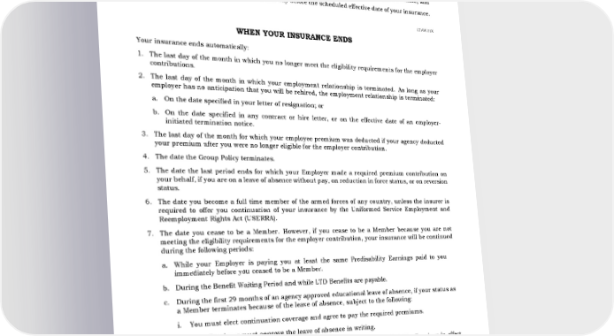 C. Exception The Active Work Requirement will not apply to you if: 1. You were absent from Active Work because of a regularly scheduled day off, holiday, or vacation day; 2. You were Actively at Work on your last scheduled work day before the date of your absence; and 3. You were capable of Active Work on the day before the scheduled effective date of your insurance. LT.AW.01X WHEN YOUR INSURANCE ENDS Your insurance ends automatically: 1. The last day of the month in which you no longer meet the eligibility requirements for the employer contributions. 2. The last day of the month in which your employment relationship is terminated. As long as your employer has no anticipation that you will be rehired, the employment relationship is terminated: a. On the date specified in your letter of resignation; or b. On the date specified in any contract or hire letter, or on the effective date of an employer- initiated termination notice. 3. The last day of the month for which your employee premium was deducted if your agency deducted your premium after you were no longer eligible for the employer contribution. 4. The date the Group Policy terminates. 5. The date the last period ends for which your Employer made a required premium contribution on your behalf, if you are on a leave of absence without pay, on reduction in force status, or on reversion status. 6. The date you become a full time member of the armed forces of any country, unless the insurer is required to offer you continuation of your insurance by the Uniformed Service Employment and Reemployment Rights Act (USERRA). 7. The date you cease to be a Member. However, if you cease to be a Member because you are not meeting the eligibility requirements for the employer contribution, your insurance will be continued during the following periods: a. While your Employer is paying you at least the same Predisability Earnings paid to you immediately before you ceased to be a Member. b. During the Benefit Waiting Period and while LTD Benefits are payable. c. During the first 29 months of an agency approved educational leave of absence, if your status as a Member terminates because of the leave of absence, subject to the following: i. You must elect continuation coverage and agree to pay the required premiums. ii. Your Employer must approve the leave of absence in writing. iii. If your rate of pay during the leave is less than 50% of your Predisability Earnings in effect prior to the leave, you must pay the entire cost of your insurance. Insurance ends automatically on the date the last period ends for which you made a premium contribution. If you become Disabled during the leave, the Benefit Waiting Period will not begin until your scheduled date of return to work. iv. If your rate of pay during the leave is 50% or more of your Predisability Earnings in effect prior to the leave, the Employer will pay the cost of your Employer-Paid Insurance. If you 377661-B - 21 6/29/2022