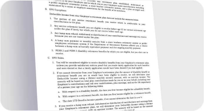 2. If you do not receive a benefit, refund, withdrawal, or distribution from your Employer's retirement plan, your Deductible Income will be: a. the retirement income benefit option that comes closest to providing you a monthly income for life with no survivor's benefit, which b. you are eligible to receive, or would have been eligible to receive had timely application been made. Your Employer's retirement plan includes any retirement plan established, maintained or participated in by your Employer and to which you or your Employer make contributions, including a public employee retirement system, a state teacher retirement system, and a plan arranged and maintained by a union or employee association for the benefit of its members. B. RPO Exceptions Deductible Income from your Employer's retirement plan does not include the amounts below. 1. The portion of any service retirement benefit you receive which is attributable to your contributions to the plan. 2. Any service retirement benefit you are eligible to receive before age 62 (or normal retirement age under the plan if later), but which you do not receive before such age. 3. Any lump sum refund, withdrawal or distribution of your contributions and earnings you receive because you are not vested under the plan. 4. A lump sum payment or monthly annuity from a state teachers retirement system or public employees retirement system if the Department of Retirement Systems offered you a choice between a lump sum actuarially equivalent payment and the ongoing monthly payment. 5. PERS 2 and PERS 3 disability retirement benefits for which you are eligible, but you elect not to receive. C. RPO Rules. 1. You will be considered eligible to receive disability benefits from your Employer's retirement plan unless you provide satisfactory written proof that you made timely application for such benefits and were denied or that a timely application would have been denied if you had applied. 2. If we cannot determine from your Employer's retirement plan the amount of disability benefit or retirement benefit you are or would have been eligible to receive, we will determine your Deductible Income using a lifetime monthly annuity amount, with no survivor income. The annuity will be based on total plan contributions made by you or on your behalf, including your Employer's contributions and roll-over contributions, plus earnings, and on the life expectancy of a person your age on the following dates: a. With respect to a disability benefit, the date you first become eligible for a disability benefit; b. With respect to a retirement benefit, the date you first become eligible for a retirement benefit; c. The date LTD Benefits become payable, if we cannot determine the date in a or b. 3. If you receive a lump sum refund, withdrawal or distribution of contributions and earnings from your Employer's retirement plan, we will determine your Deductible Income using a lifetime monthly annuity amount, with no survivor income. The annuity will be based on the amount you receive, and on the life expectancy of a person your age on the later of: a. The date the lump sum is paid; and b. The date LTD Benefits become payable. LT.RO.01X 377661-B - 12 6/29/2022