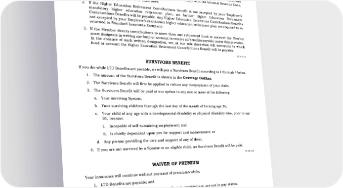 1. The date Employee-Paid LTD Benefits cease to be payable. 2. The date the Employer’s higher education retirement plan in which you participate terminates or may no longer accept the Higher Education Retirement Contributions Benefit on your behalf. D. Other Provisions 1. We may terminate or change the amount of your Higher Education Retirement Contributions Benefit at the Policyholder’s request when necessary to comply with the Internal Revenue Code, ERISA, or any other federal or state laws. 2. If the Higher Education Retirement Contributions Benefit is not accepted by your Employer’s mandatory higher education retirement plan, no further Higher Education Retirement Contributions Benefits will be payable. Any Higher Education Retirement Contributions Benefits not accepted by your Employer’s mandatory higher education retirement plan are required to be returned to Standard Insurance Company. 3. If the Member directs contributions to more than one retirement fund or account the Member must designate in writing one fund or account to receive all benefits payable under this provision. In the absence of such written designation, we, at our sole discretion will determine to which fund or account the Higher Education Retirement Contributions Benefit will be payable. LT.PC.01X SURVIVORS BENEFIT If you die while LTD Benefits are payable, we will pay a Survivors Benefit according to 1 through 4 below. 1. The amount of the Survivors Benefit is shown in the Coverage Outline. 2. The Survivors Benefit will first be applied to reduce any overpayment of your claim. 3. The Survivors Benefit will be paid at our option to any one or more of the following: a. Your surviving Spouse; b. Your surviving children through the last day of the month of turning age 26; c. Your child of any age with a developmental disability or physical disability who, prior to age 26, became: i. Incapable of self-sustaining employment; and ii. Is chiefly dependent upon you for support and maintenance; or d. Any person providing the care and support of any of them. 4. If you are not survived by a Spouse or an eligible child, no Survivors Benefit will be paid. LT.SB.01X WAIVER OF PREMIUM Your insurance will continue without payment of premiums while: 1. LTD Benefits are payable; and 2. You are completing the Benefit Waiting Period, provided you are not in pay status. LT.WP.01X BENEFITS AFTER INSURANCE ENDS OR IS CHANGED Your right to receive LTD Benefits for a period of Disability which begins while you are insured will not be affected by: 377661-B - 14 6/29/2022