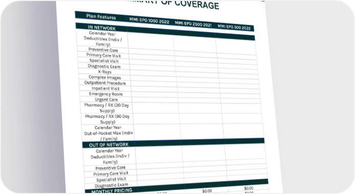 Plan Features MMI EPO 1000 2022 MMI EPO 2500 2021 MMI EPO 500 2022 IN NETWORK Calendar Year Deductibles (Indiv / Family) Preventive Care Primary Care Visit Specialist Visit Diagnostic Exam X-Rays Complex Images Outpatient Procedure Inpatient Visit Emergency Room Urgent Care Pharmacy / RX (30 Day Supply) Pharmacy / RX (90 Day Supply) Calendar Year Out-of-Pocket Max (Indiv / Family) OUT OF NETWORK Calendar Year Deductibles (Indiv / Family) Preventive Care Primary Care Visit Specialist Visit Diagnostic Exam MONTHLY PRICING Employee $0.00 $0.00 $0.00 Employee + Spouse $0.00 $0.00 $0.00 Employee + Child(ren) $0.00 $0.00 $0.00 Employee + Family $0.00 $0.00 $0.00 SUMMARY OF COVERAGE MEDICAL PLAN