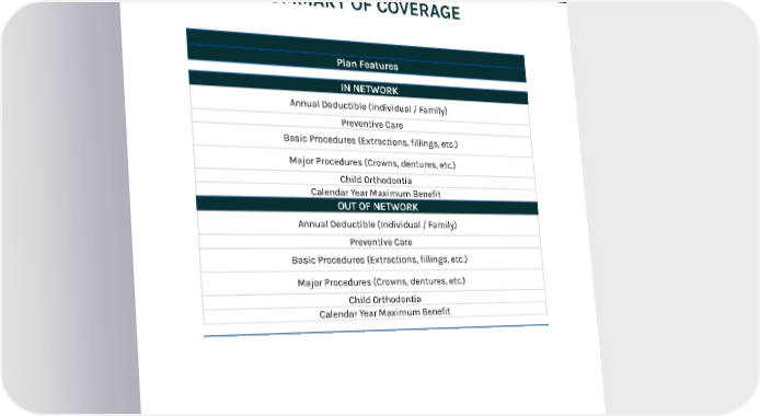 Plan Features IN NETWORK Annual Deductible (Individual / Family) Preventive Care Basic Procedures (Extractions, fillings, etc.) Major Procedures (Crowns, dentures, etc.) Child Orthodontia Calendar Year Maximum Benefit OUT OF NETWORK Annual Deductible (Individual / Family) Preventive Care Basic Procedures (Extractions, fillings, etc.) Major Procedures (Crowns, dentures, etc.) Child Orthodontia Calendar Year Maximum Benefit SUMMARY OF COVERAGE DENTAL PLANS