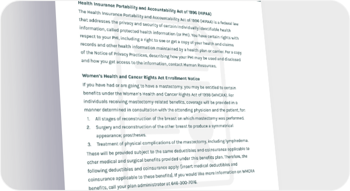 LEGAL NOTICES Health Insurance Portability and Accountability Act of 1996 (HIPAA) The Health Insurance Portability and Accountability Act of 1996 (HIPAA) is a federal law that addresses the privacy and security of certain individually identifiable health information, called protected health information (or PHI). You have certain rights with respect to your PHI, including a right to see or get a copy of your health and claims records and other health information maintained by a health plan or carrier. For a copy of the Notice of Privacy Practices, describing how your PHI may be used and disclosed and how you get access to the information, contact Human Resources. Women’s Health and Cancer Rights Act Enrollment Notice If you have had or are going to have a mastectomy, you may be entitled to certain benefits under the Woman’s Health and Cancer Rights Act of 1998 (WHCRA). For individuals receiving mastectomy-related benefits, coverage will be provided in a manner determined in consultation with the attending physician and the patient, for: 1. All stages of reconstruction of the breast on which mastectomy was performed. 2. Surgery and reconstruction of the other breast to produce a symmetrical appearance; prostheses. 3. Treatment of physical complications of the mastectomy, including lymphedema. These will be provided subject to the same deductibles and coinsurance applicable to other medical and surgical benefits provided under this benefits plan. Therefore, the following deductibles and coinsurance apply: [insert medical deductibles and coinsurance applicable to these benefits]. If you would like more information on WHCRA benefits, call your plan administrator at 646-300-7016.