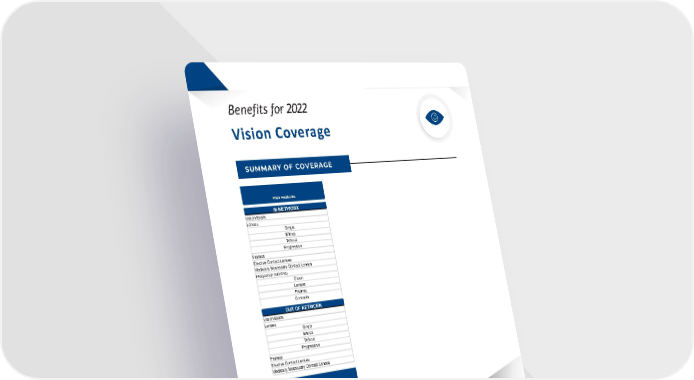 2022 Employee Benefit Guide This booklet provides only a summary of your benefits. All services described within are subject to the definitions, limitations, and exclusions set forth in each insurance carrier or provider’s contract. Plan Features IN NETWORK Vision Exam Lenses Single Bifocal Trifocal Progressive Frames Elective Contact Lenses Medically Necessary Contact Lenses Frequency (Months) Exam Lenses Frames Contacts OUT OF NETWORK Vision Exam Lenses Single Bifocal Trifocal Progressive Frames Elective Contact Lenses Medically Necessary Contact Lenses SUMMARY OF COVERAGE Benefits f or 2022 Vision Coverage 10