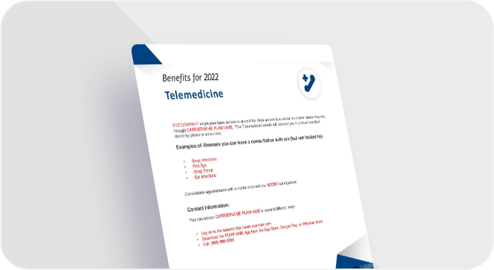 2022 Employee Benefit Guide This booklet provides only a summary of your benefits. All services described within are subject to the definitions, limitations, and exclusions set forth in each insurance carrier or provider’s contract. Benefits f or 2022 Telemedicine XYZ COMPANY employees have access to around the clock access to a doctor, no matter where they are, through CARRIERNAME PLANNAME . This Telemedicine benefit will connect you to a board - certified doctor by phone or video chat. Examples of illnesses you can have a consultation with are (but not limited to): • Sinus Infections • Pink Eye • Strep Throat • Ear Infections Consultation appointments with a doctor only cost you $COST out of pocket. You can access CARRIERNAME PLANNAME in several different ways: Contact Information: • Log on to the website http://www.example.com • Download the PLANNAME App from the App Store, Google Play, or Windows Store • Call (888) 888 - 8888 16