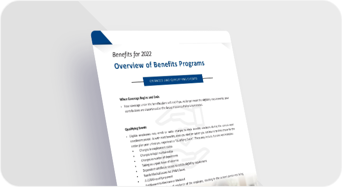 2022 Employee Benefit Guide This booklet provides only a summary of your benefits. All services described within are subject to the definitions, limitations, and exclusions set forth in each insurance carrier or provider’s contract. C HA NG E S A ND Q U A L I F Y I NG E V E NT S When Coverage Begins and Ends › Your coverage under the benefits plans will end if you no longer meet the eligibility requirements, your contributions are discontinued or the Group Insurance Policy is terminated . Qualifying Events › Eligible employees may enroll or make changes to their benefits elections during the annual open enrollment period . As with most benefits, once you elect an option you are bound to that choice for the entire plan year unless you experience a “Qualifying Event” . These may include, but are not limited to : • Changes in employment status • Changes in legal marital status • Changes in number of dependents • Taking an unpaid leave of absence • Dependent satisfies or ceases to satisfy eligibility requirement • Family Medical Leave Act (FMLA) leave . • A COBRA - qualifying event • Entitlement to Medicare or Medicaid • A change in the place of residence of the employee, resulting in the current carrier not being available Benefits f or 2022 Overview of Benefits Programs 4