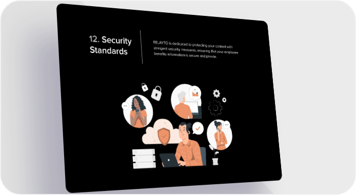 Benefits Offering Presentation Page 14 Page 1612. Security Standards RELAYTO is dedicated to protecting your content with stringent security measures, ensuring that your employee benefits information is secure and private.