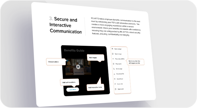 3. Secure and Interactive Communication RELAYTO takes employee benefits communication to the next level by enhancing your PDFs with interactive elements. This creates a more engaging experience within a secure environment. Share your benefits documents with confidence, knowing they are safeguarded by RELAYTO’s robust security features, ensuring confidentiality and integrity. Add call-to-actions Add interactive icons Learn More Benefits Guide Embed videos Add images Select an action that will happen on click