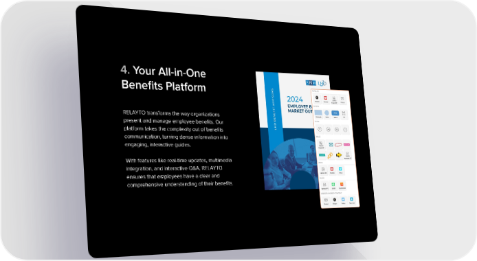 4. Your All-in-One Benefits Platform RELAYTO transforms the way organizations present and manage employee benefits. Our platform takes the complexity out of benefits communication, turning dense information into engaging, interactive guides. With features like real-time updates, multimedia integration, and interactive Q&A, RELAYTO ensures that employees have a clear and comprehensive understanding of their benefits.