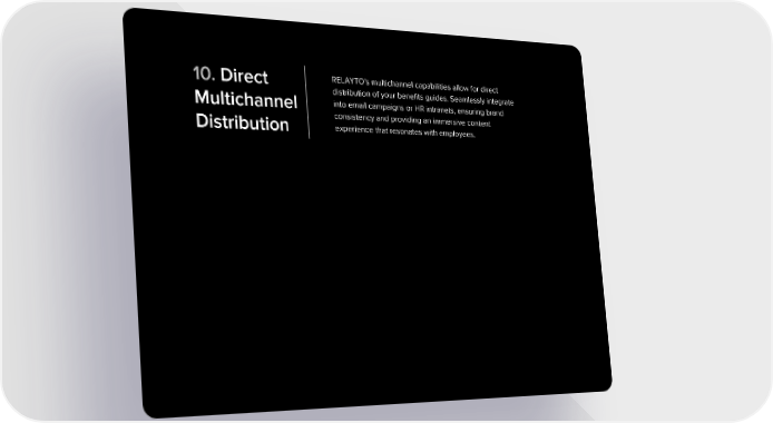 10. Direct Multichannel Distribution RELAYTO’s multichannel capabilities allow for direct distribution of your benefits guides. Seamlessly integrate into email campaigns or HR intranets, ensuring brand consistency and providing an immersive content experience that resonates with employees.