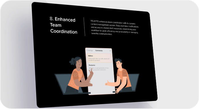 8. Enhanced Team Coordination RELAYTO enhances team coordination with its dynamic content management system. Enjoy real-time modifications and access to shared draft resources, streamlining your workflow for peak efficiency and productivity in managing benefits communication.