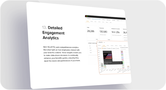 13. Detailed Engagement Analytics With RELAYTO, gain comprehensive analytics that shed light on how employees interact with your benefits content. These insights enable you to make data-driven decisions to continually enhance your benefits guides, ensuring they meet the needs and preferences of your team.