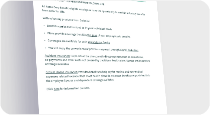 COLONIAL LIFE VOLUNTARY BENEFIT OFFERINGS FROM COLONIAL LIFE All Acme Corp benefit eligible employees have the opportunity to enroll in Voluntary Benefits from Colonial Life. With voluntary products from Colonial: • Benefits can be customized to fit your individual needs • Plans provide coverage that fills the gaps of your employer paid benefits • Coverages are available for both you and your family • You will enjoy the convenience of premium payment through Payroll Deduction. Accident Insurance: Helps offset the direct and indirect expenses such as deductibles, co-payments and other costs not covered by traditional health plans. Spouse and dependent coverage available Critical Illness Insurance: Provides benefits to help pay for medical and non-medical expenses related to cancer that most health plans do not cover. Benefits are paid directly to the employee Spouse and dependent coverage available. Click here for information on rates